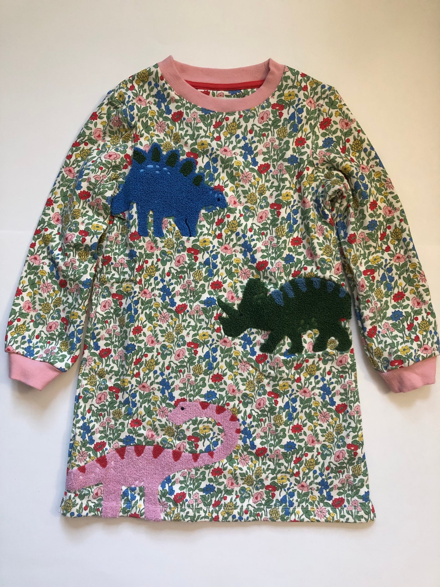 NWOT Mini Boden Ida Sweatshirt Appliqué Dress-Multi Meadow Floral Dinosaurs