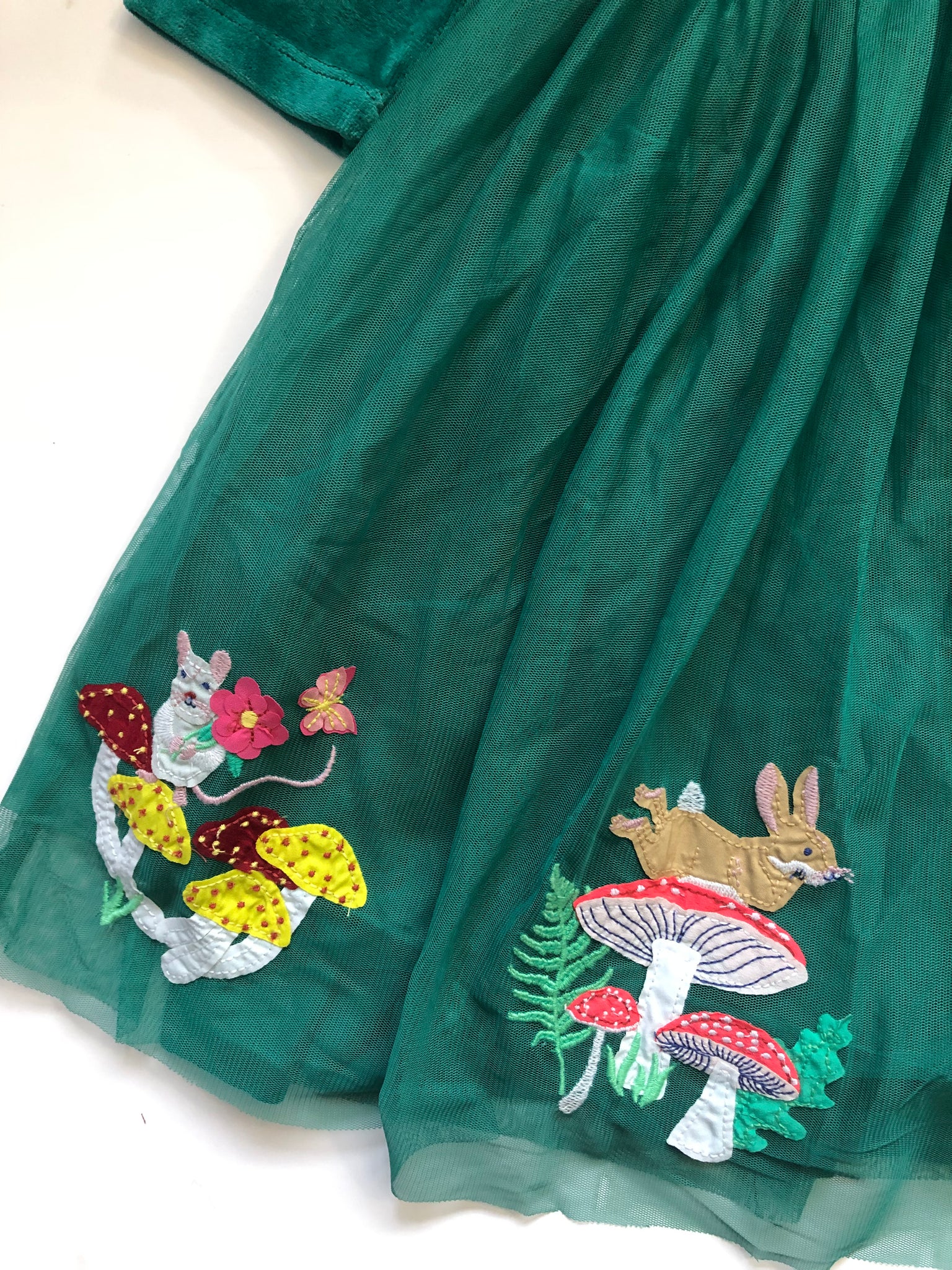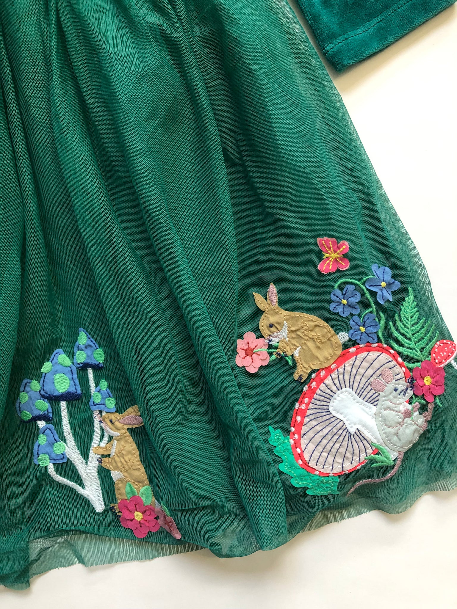 NWOT Mini Boden Velvet Tulle Appliqué Dress-Alpine Green Woodland Animals. Stunning!
