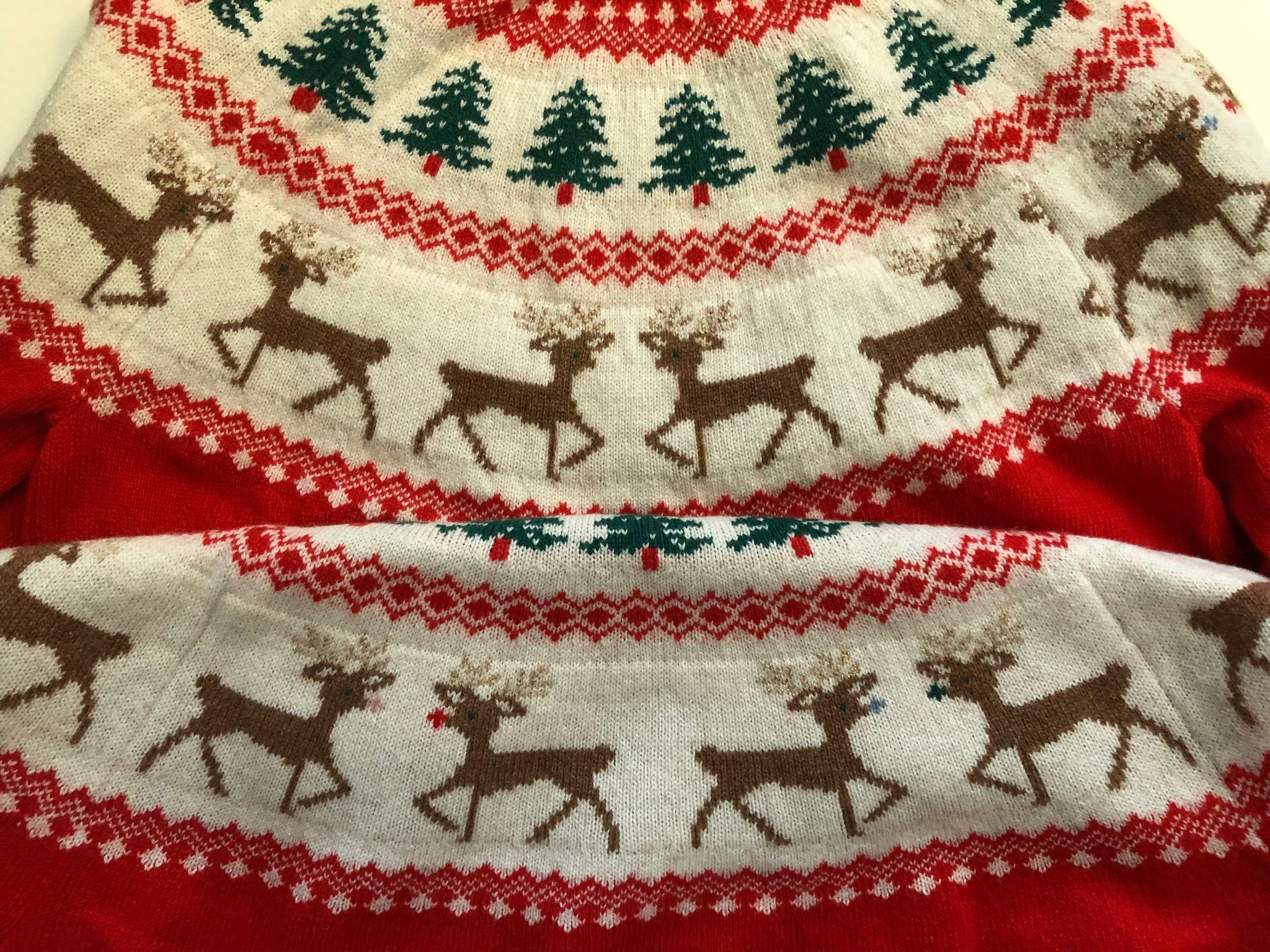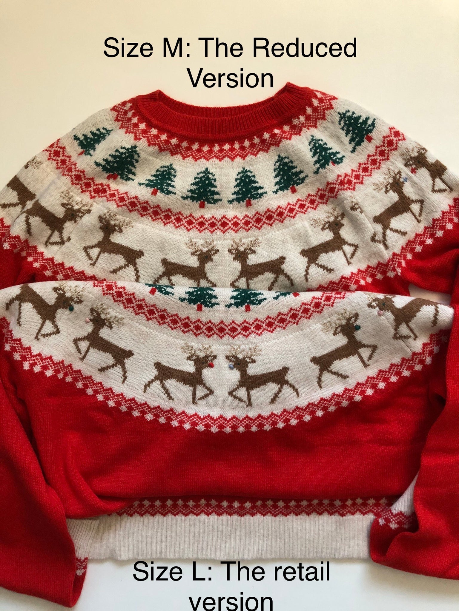 For photos 8–12, both the upper (Size M) and lower (Size L) sweaters show samples. They are included for reference to illustrate how the Size M sample differs from the retail version. For this M size, the reindeer mouth details are plain on both the front and back, without the raised embroidery on the front or the cross-stitch knit detail on the back. The manufacturer produced a few versions before the final one was chosen, so slight variations may exist in sample pieces. Size M is rare, so I kept this piece to offer in case someone is interested.