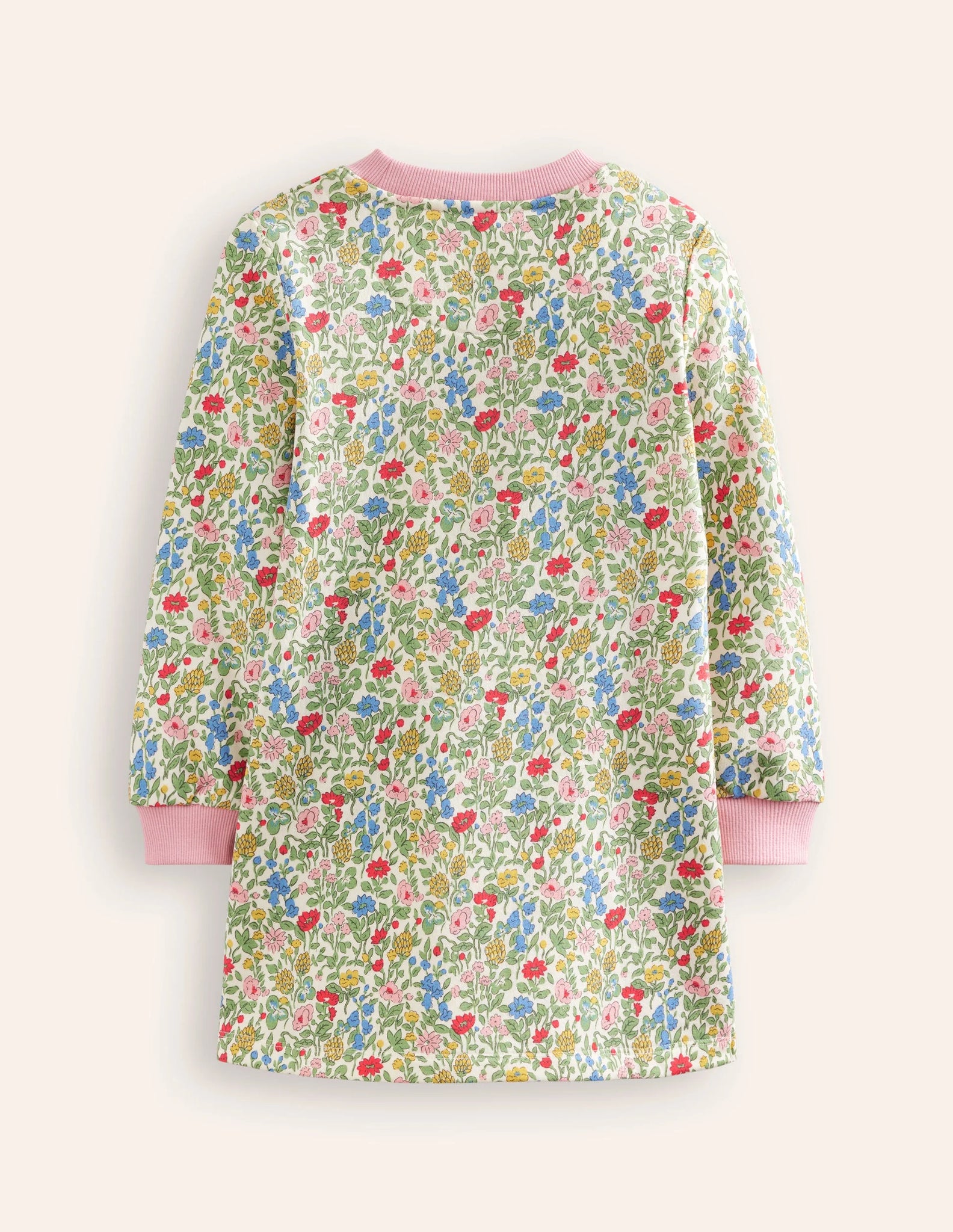 NWOT Mini Boden Ida Sweatshirt Appliqué Dress-Multi Meadow Floral Dinosaurs