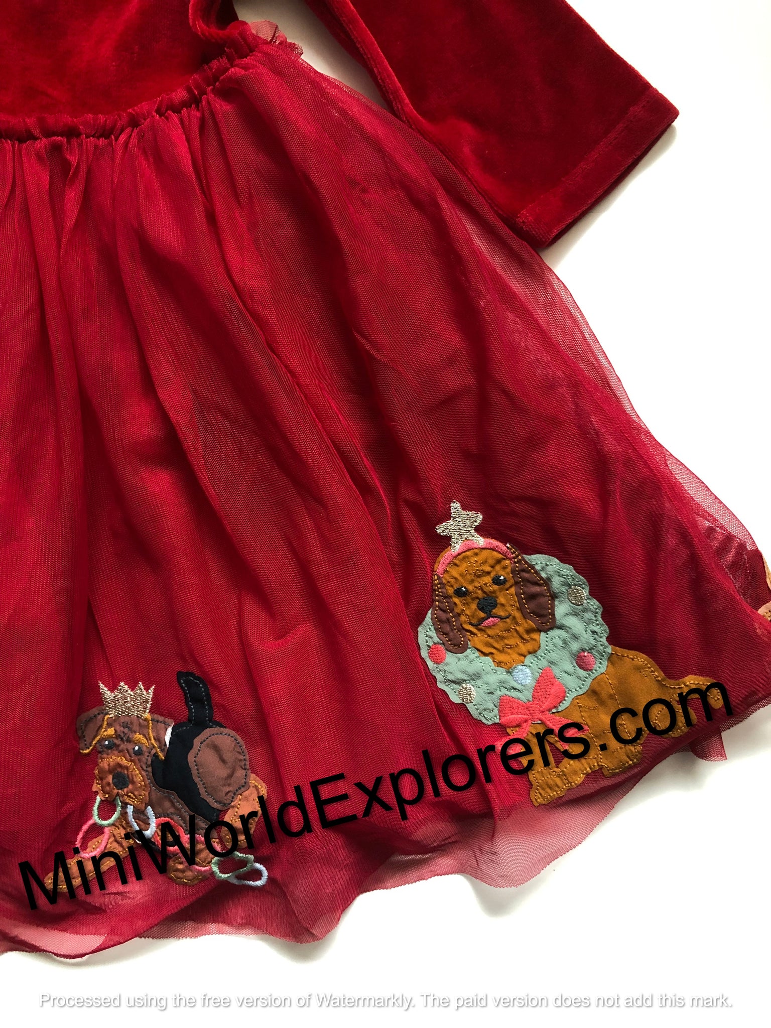 NWOT Mini Boden Velvet Tulle Appliqué Dress-Red Festive dogs. Super cute!