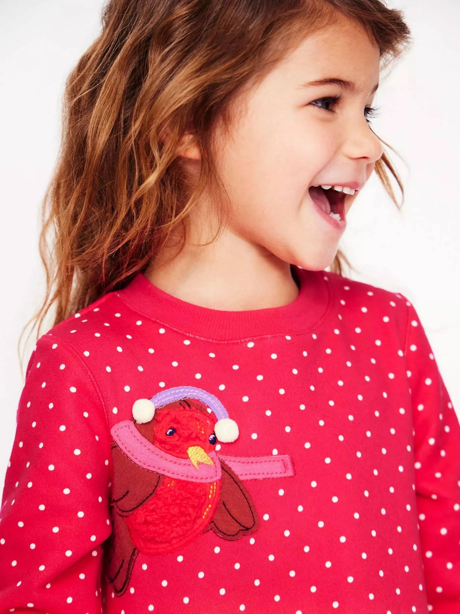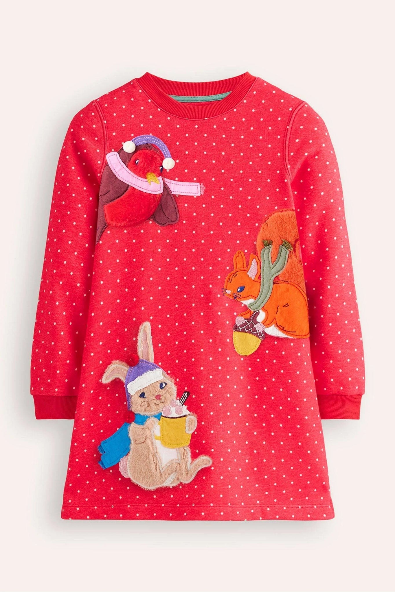 NWOT Mini Boden Ida Sweatshirt Appliqué Dress-Rose Pink Pin Spot Animals